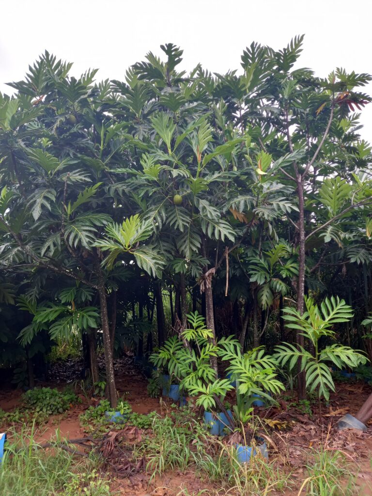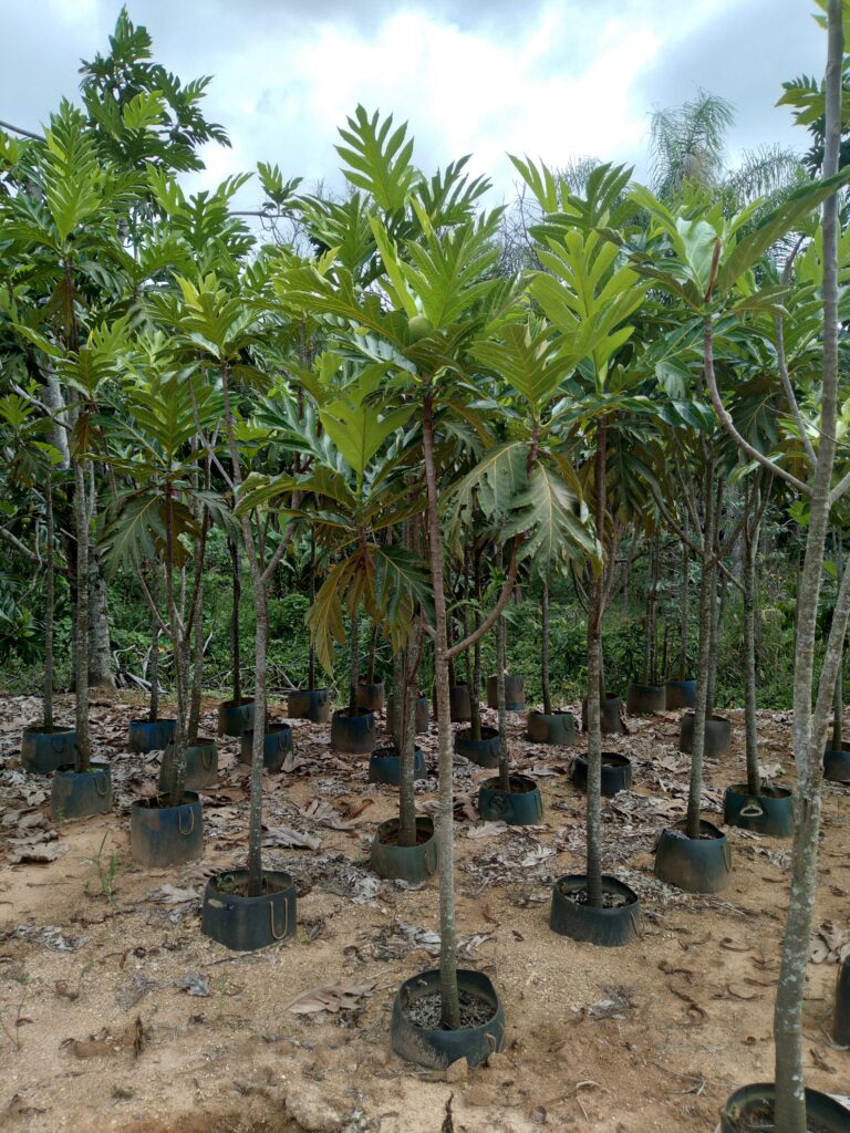 Originária da Ásia, a árvore de fruta-pão é valorizada pela copa imponente e pelos frutos nutritivos, que servem como base alimentar em várias culturas tropicais.